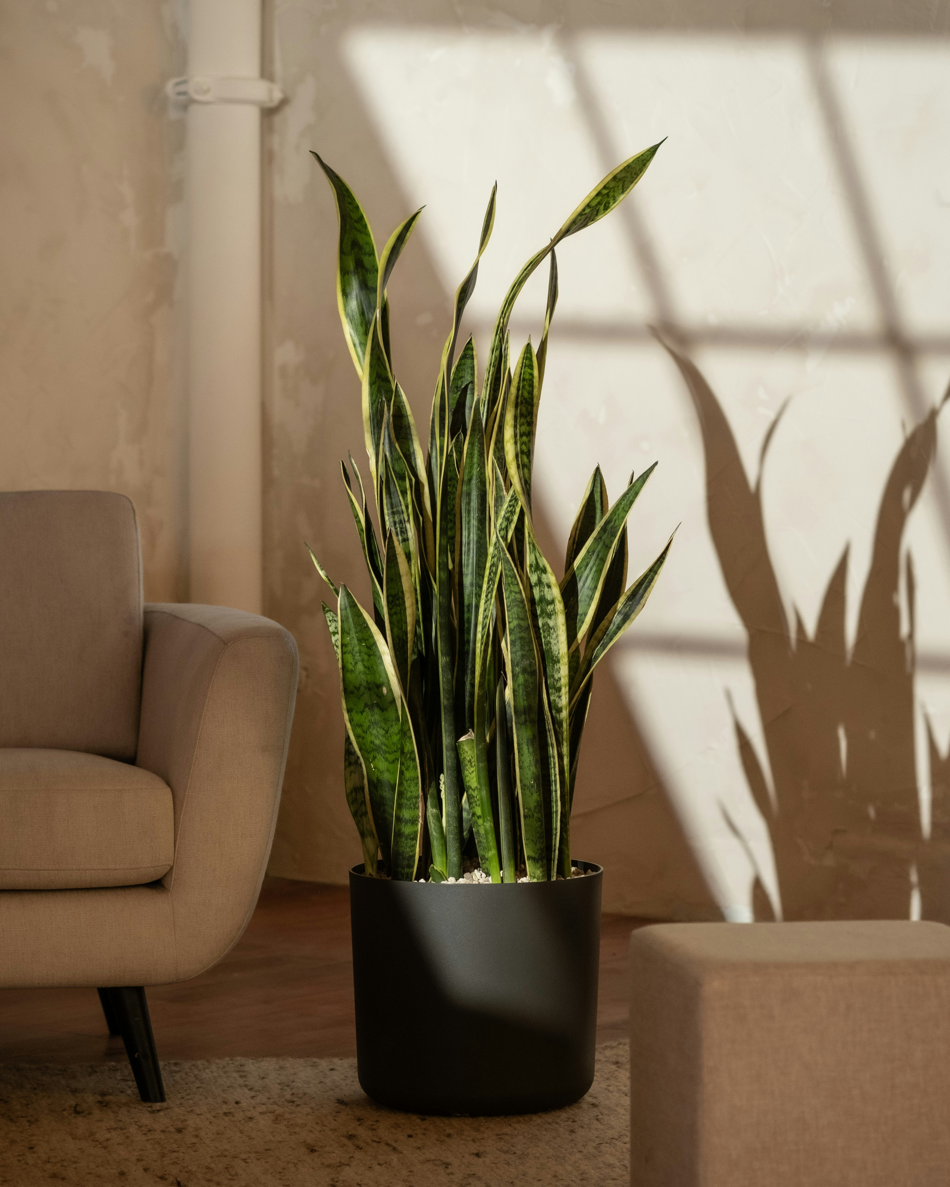 The Snake Plant (Sansevieria trifasciata), also known as Mother-in-Law’s Tongue, is a striking and hardy indoor plant with upright, sword-like leaves marked with green and silver bands. Known for its bold, architectural form, this plant is perfect for modern and minimalist interiors, adding a touch of nature to any room. With a reputation as one of the best air-purifying plants, the Snake Plant is both a stylish and health-boosting addition to any space.